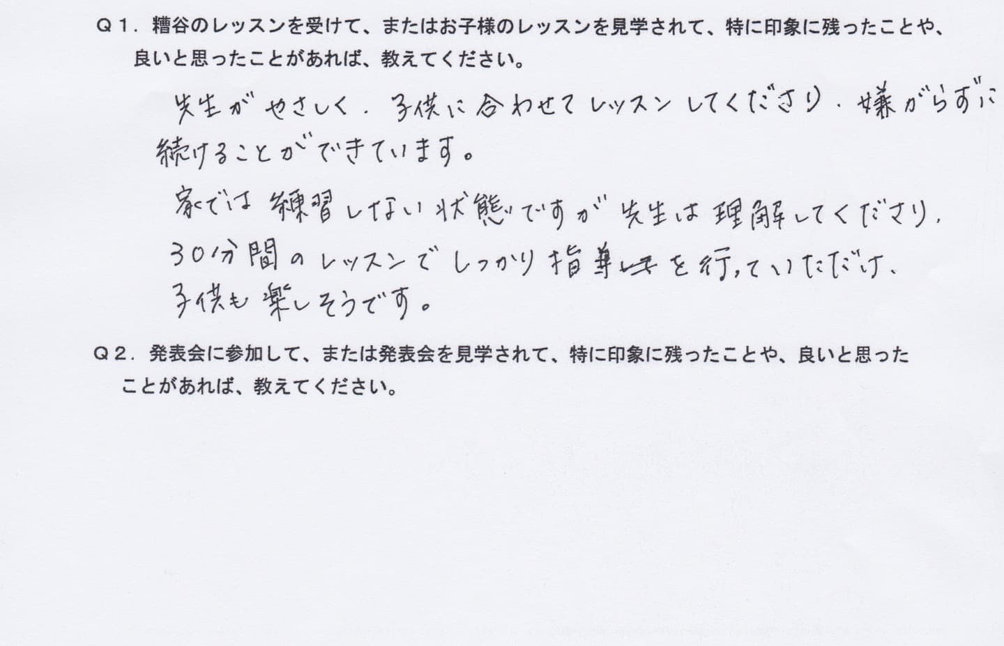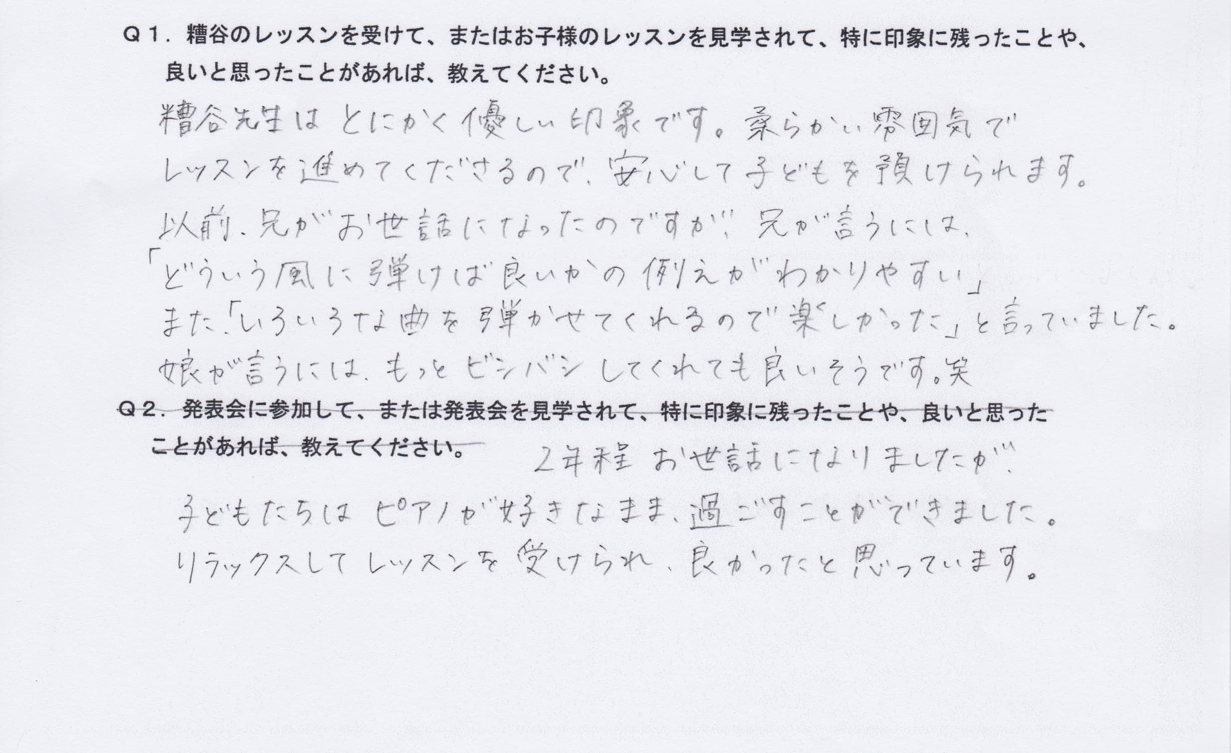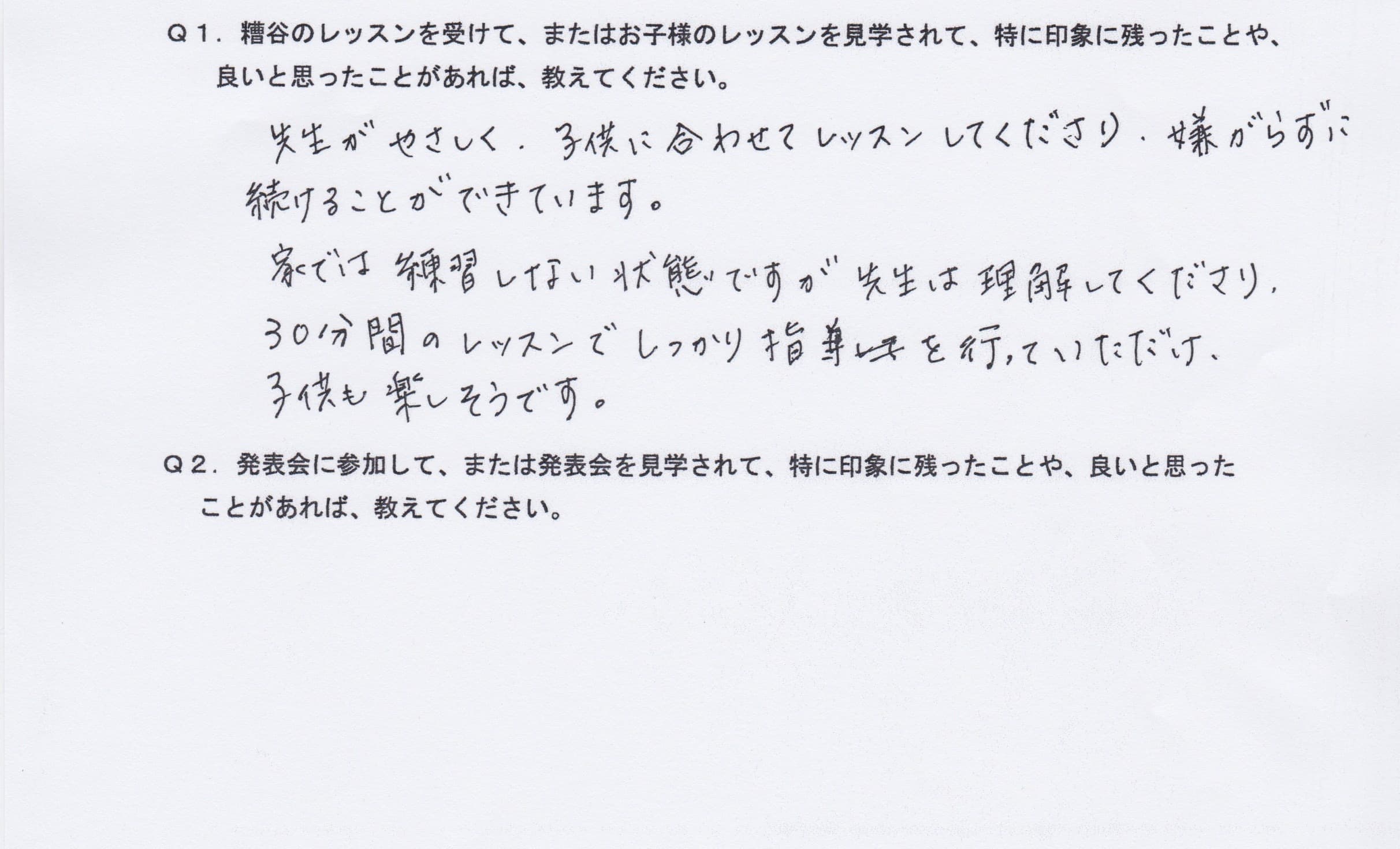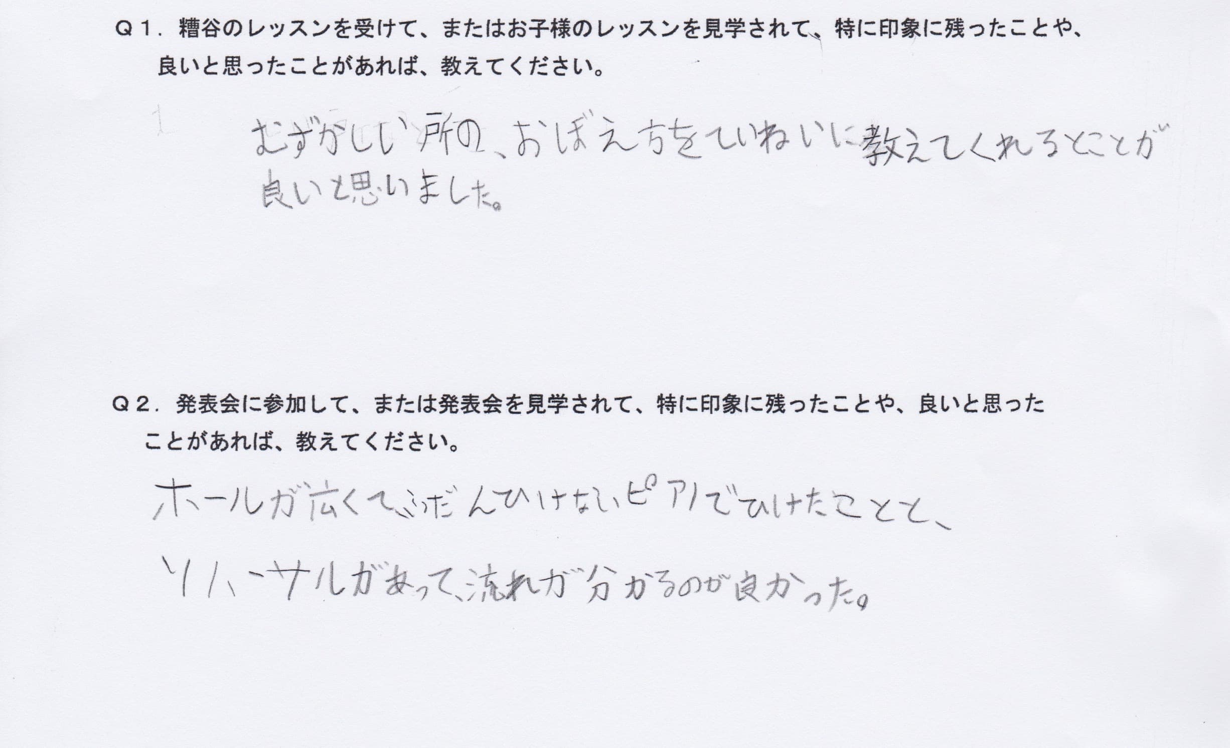 Q1.糟谷のレッスンを受けて、またはお子様のレッスンを見学されて、特に印象に残ったことや、良いと思ったことがあれば教えてください。