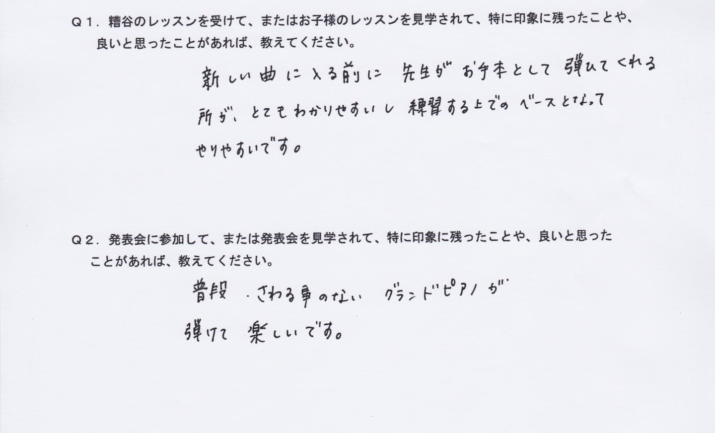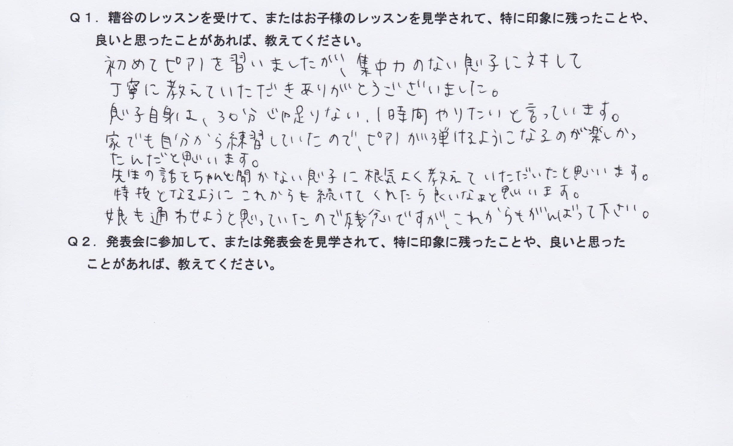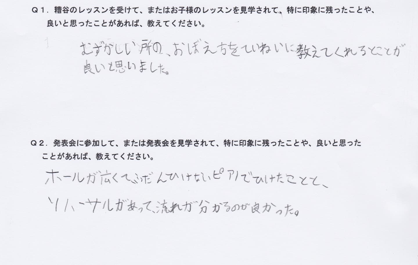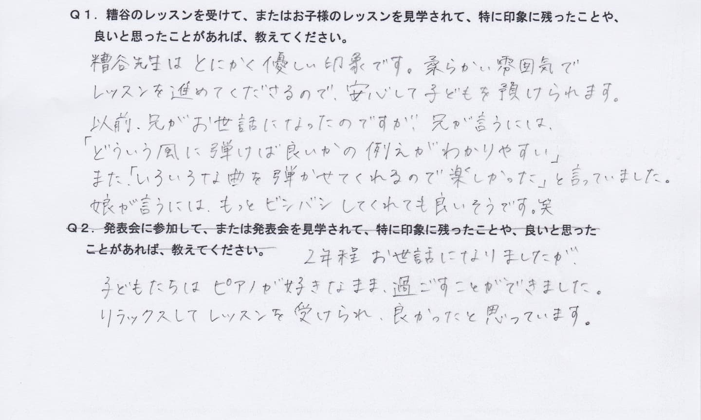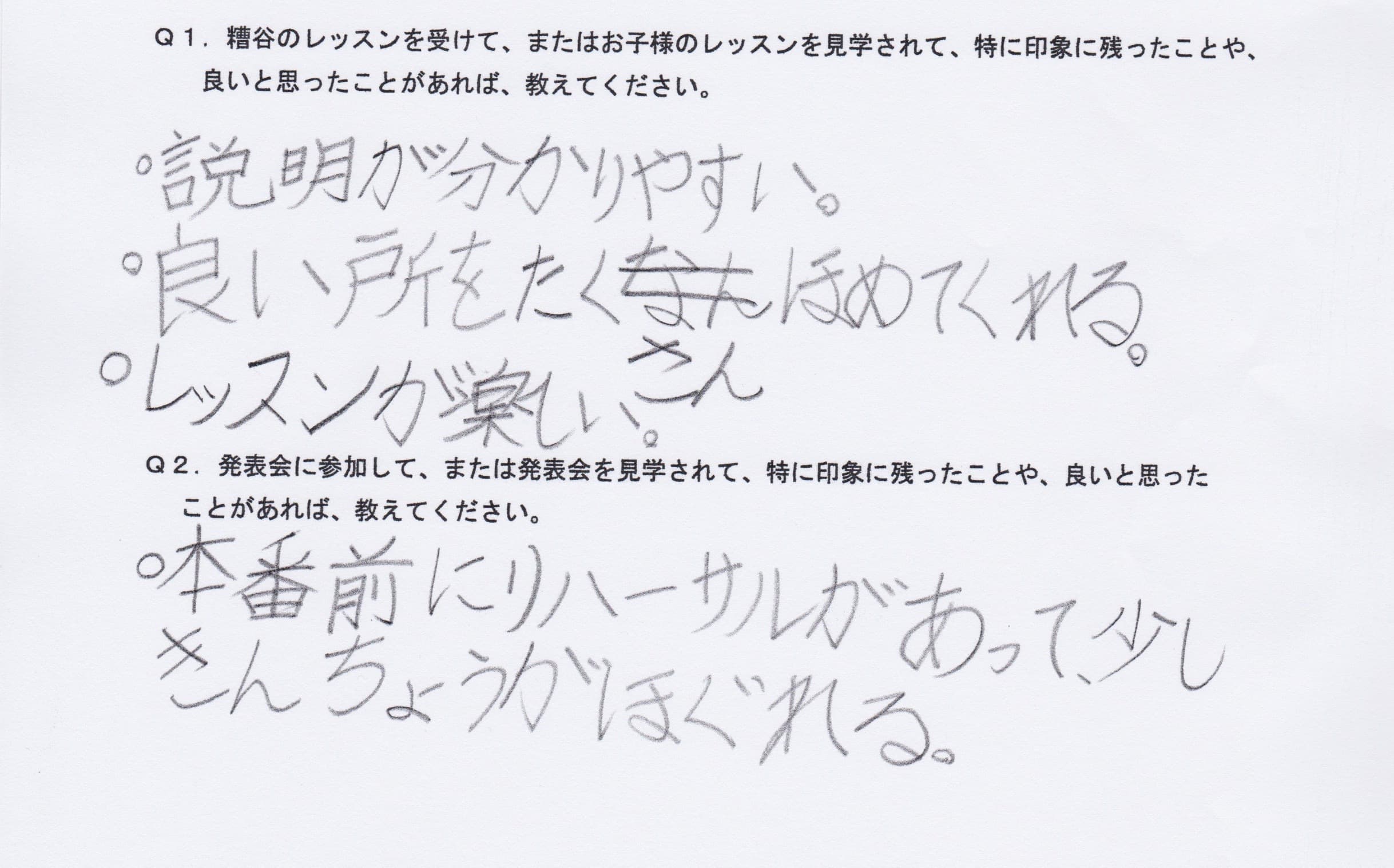 Q1.糟谷のレッスンを受けて、またはお子様のレッスンを見学されて、特に印象に残ったことや、良いと思ったことがあれば教えてください。