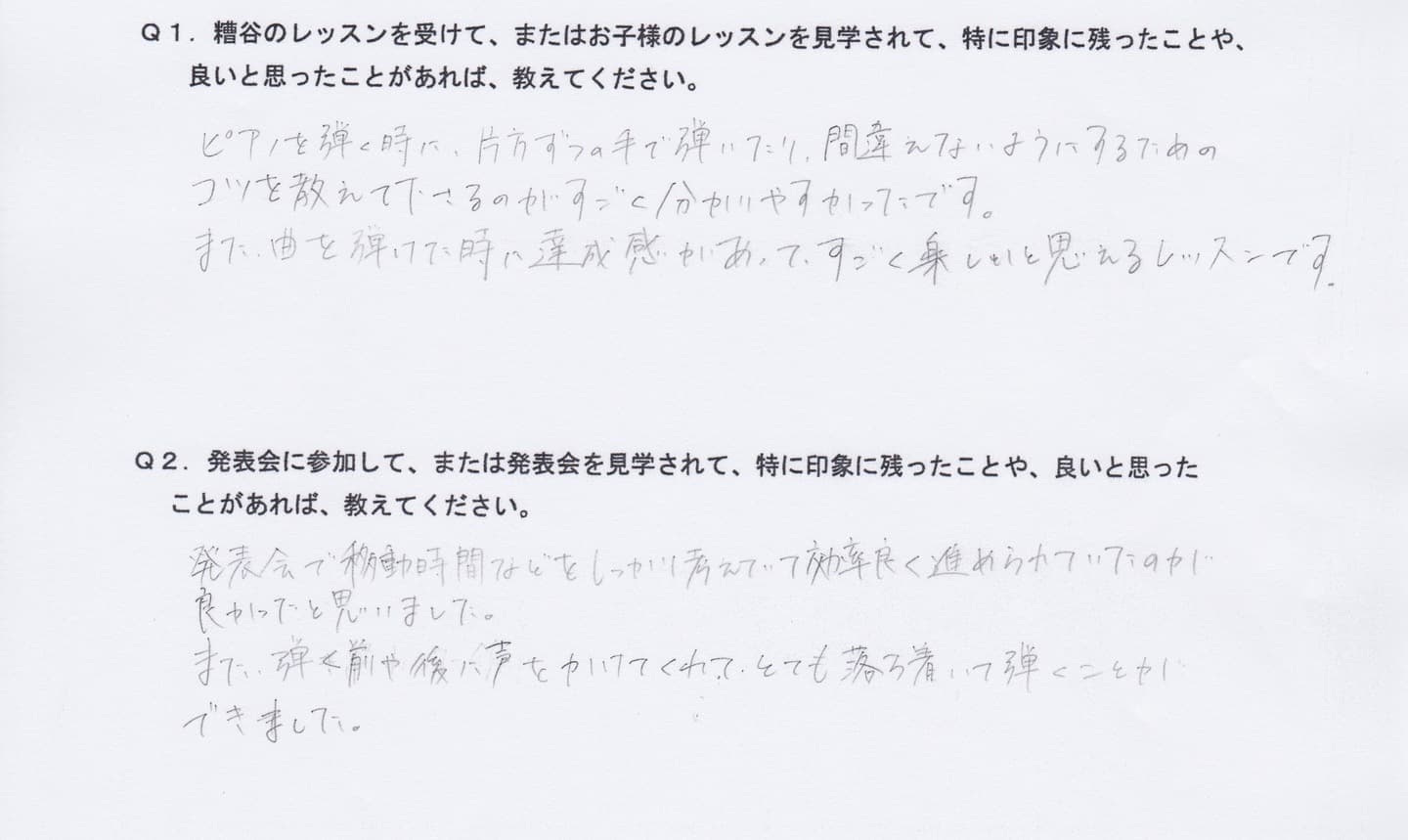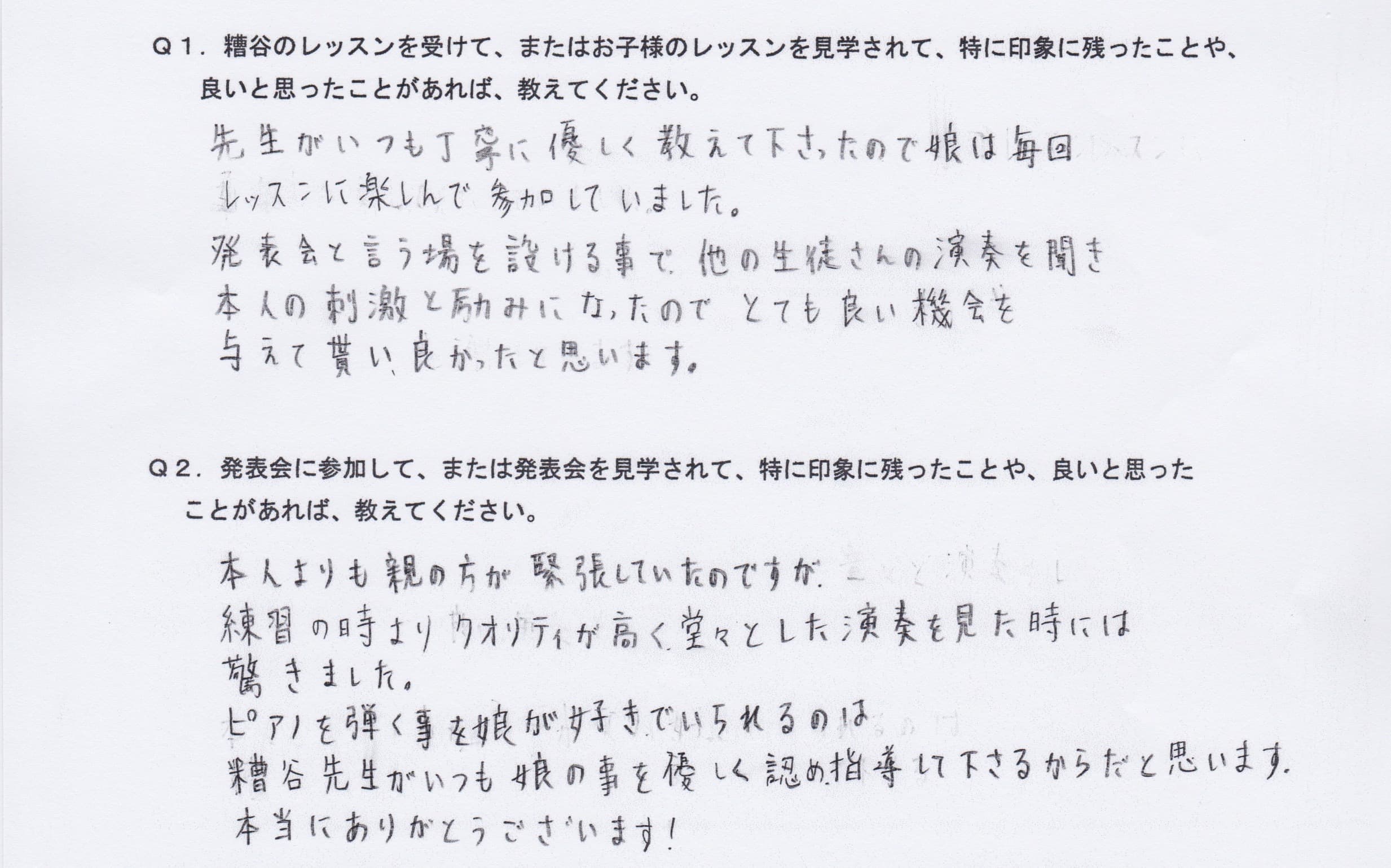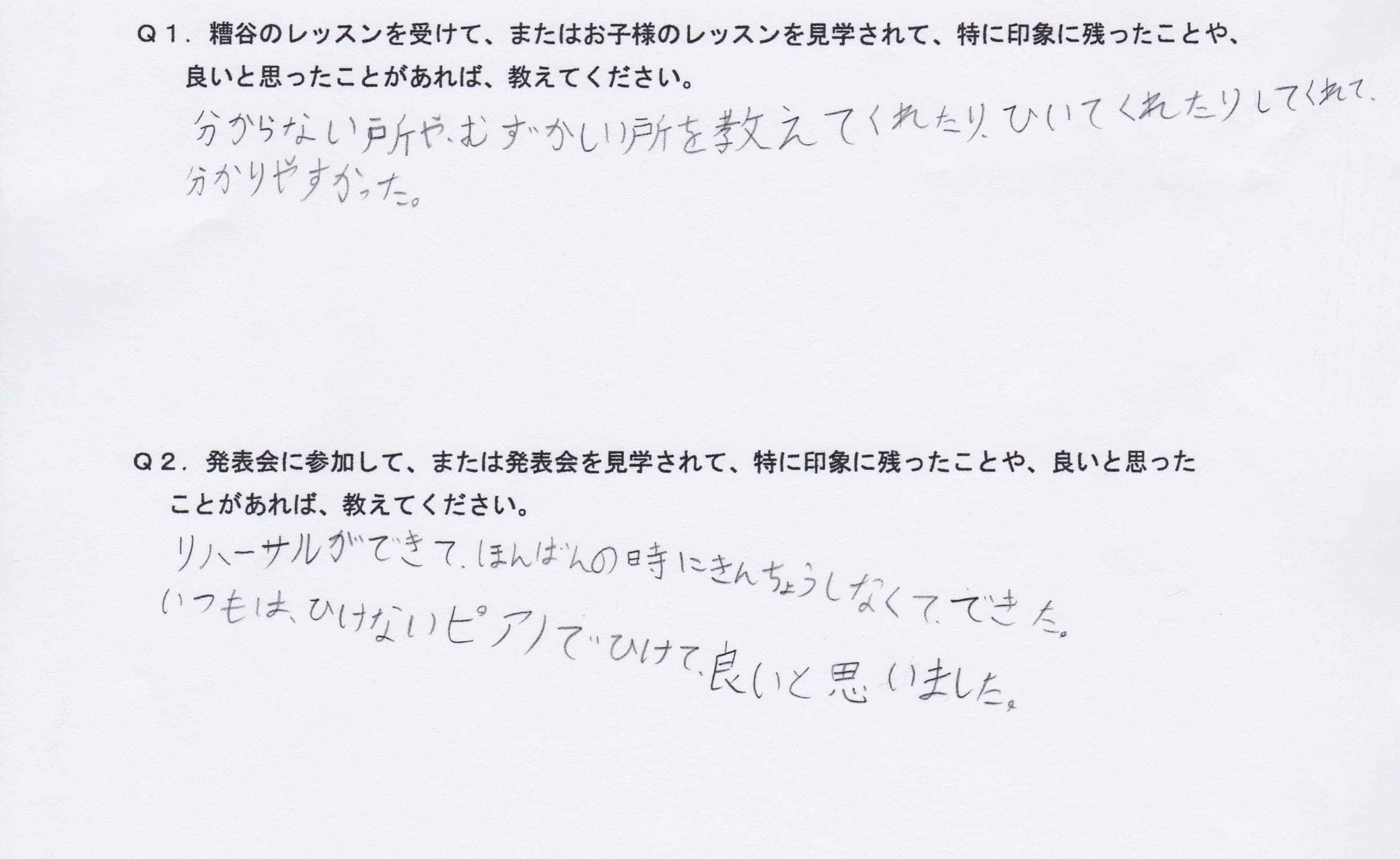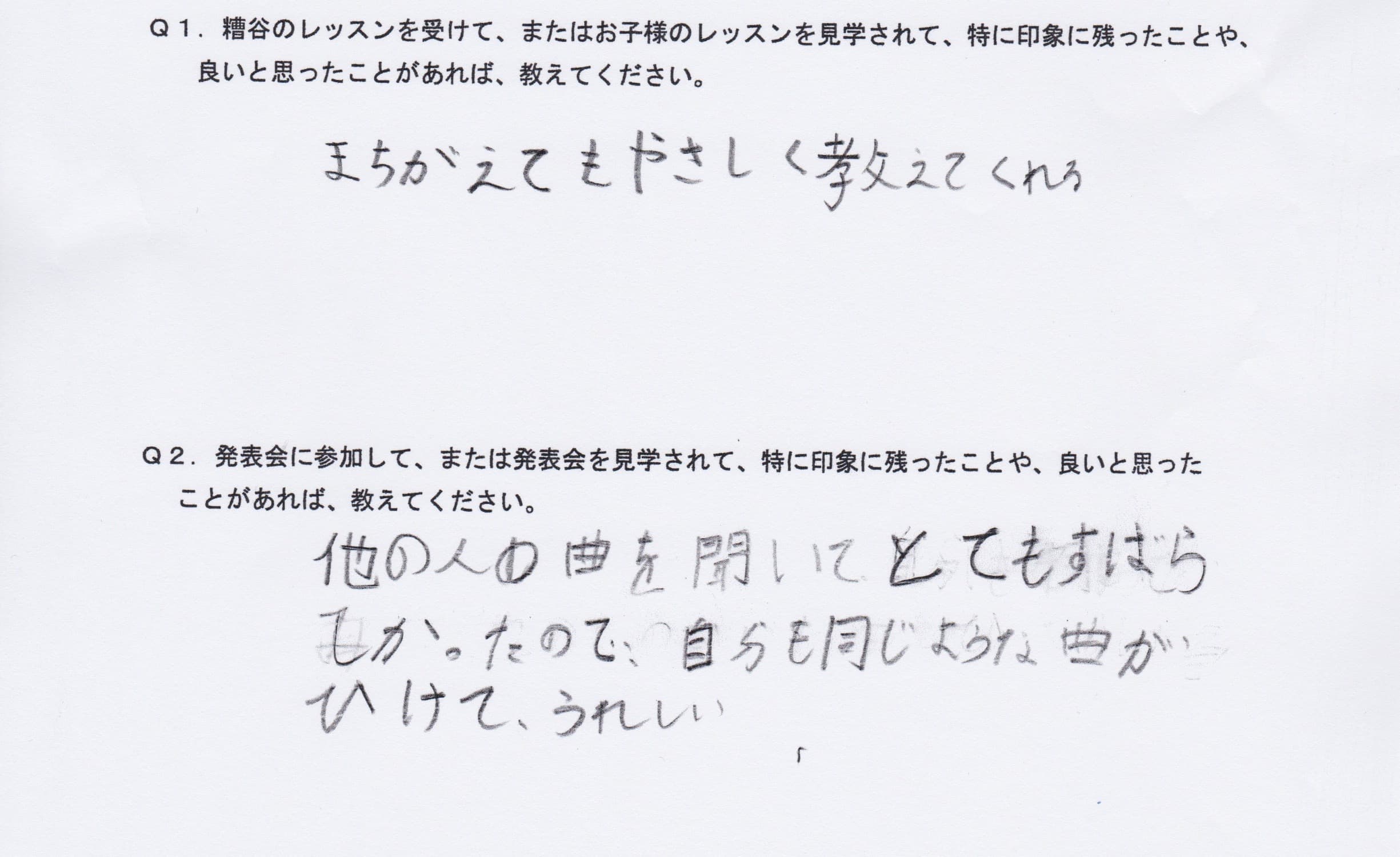 Q1.糟谷のレッスンを受けて、またはお子様のレッスンを見学されて、特に印象に残ったことや、良いと思ったことがあれば教えてください。