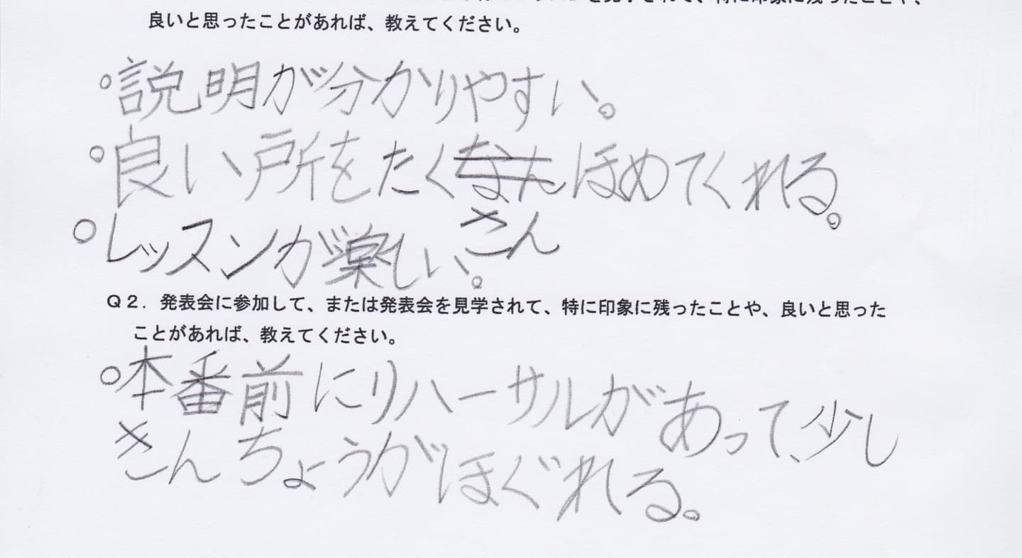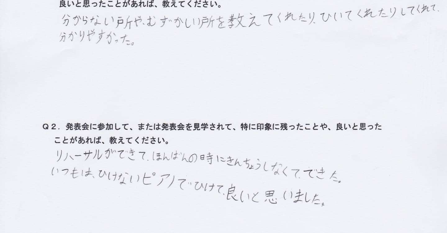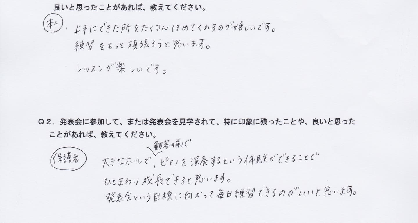 発表会と言う場を設ける事で他の生徒さんの演奏を聞き本人の刺激と励みになったのでとても良い機会を与えて貰い、良かったと思います。