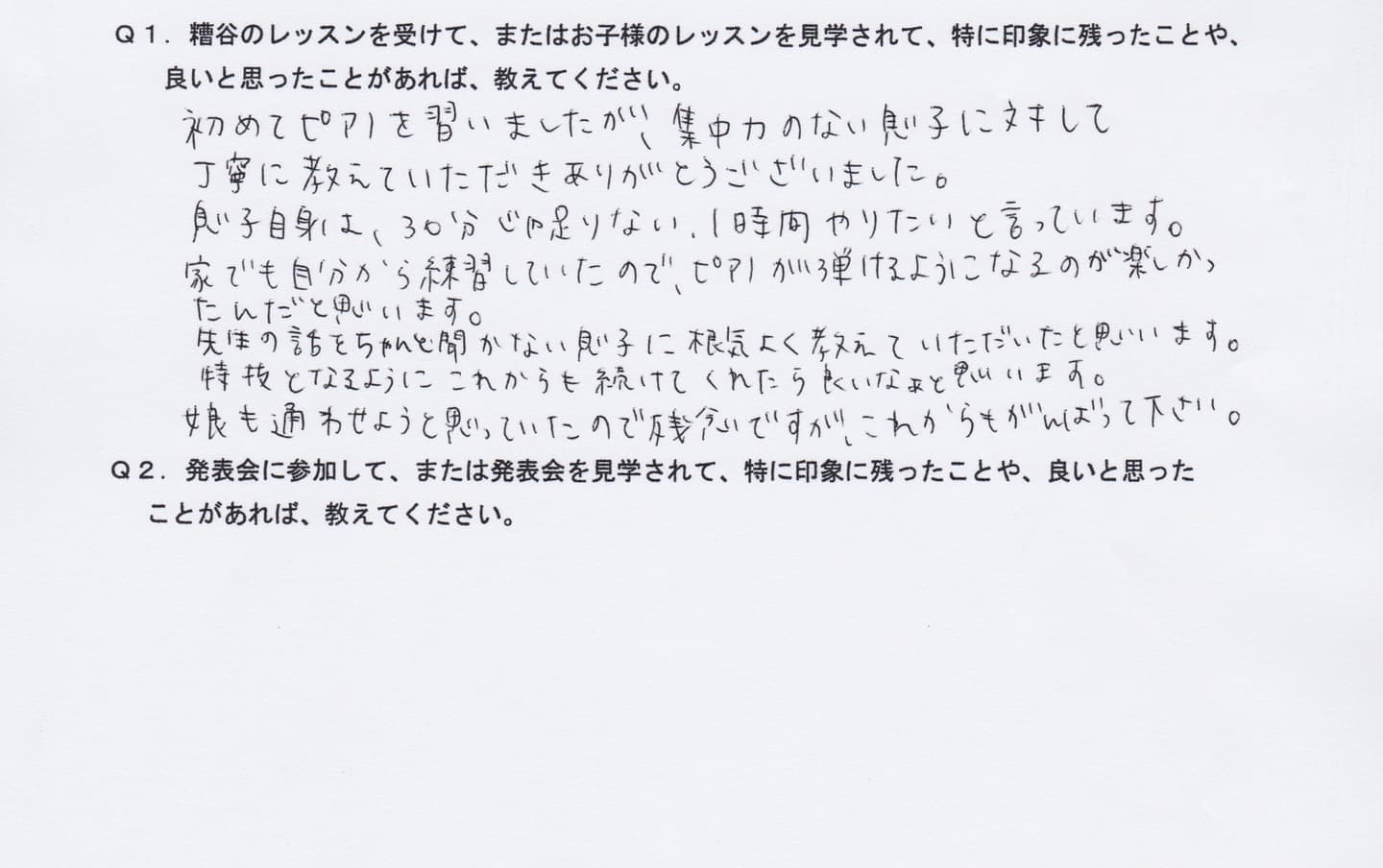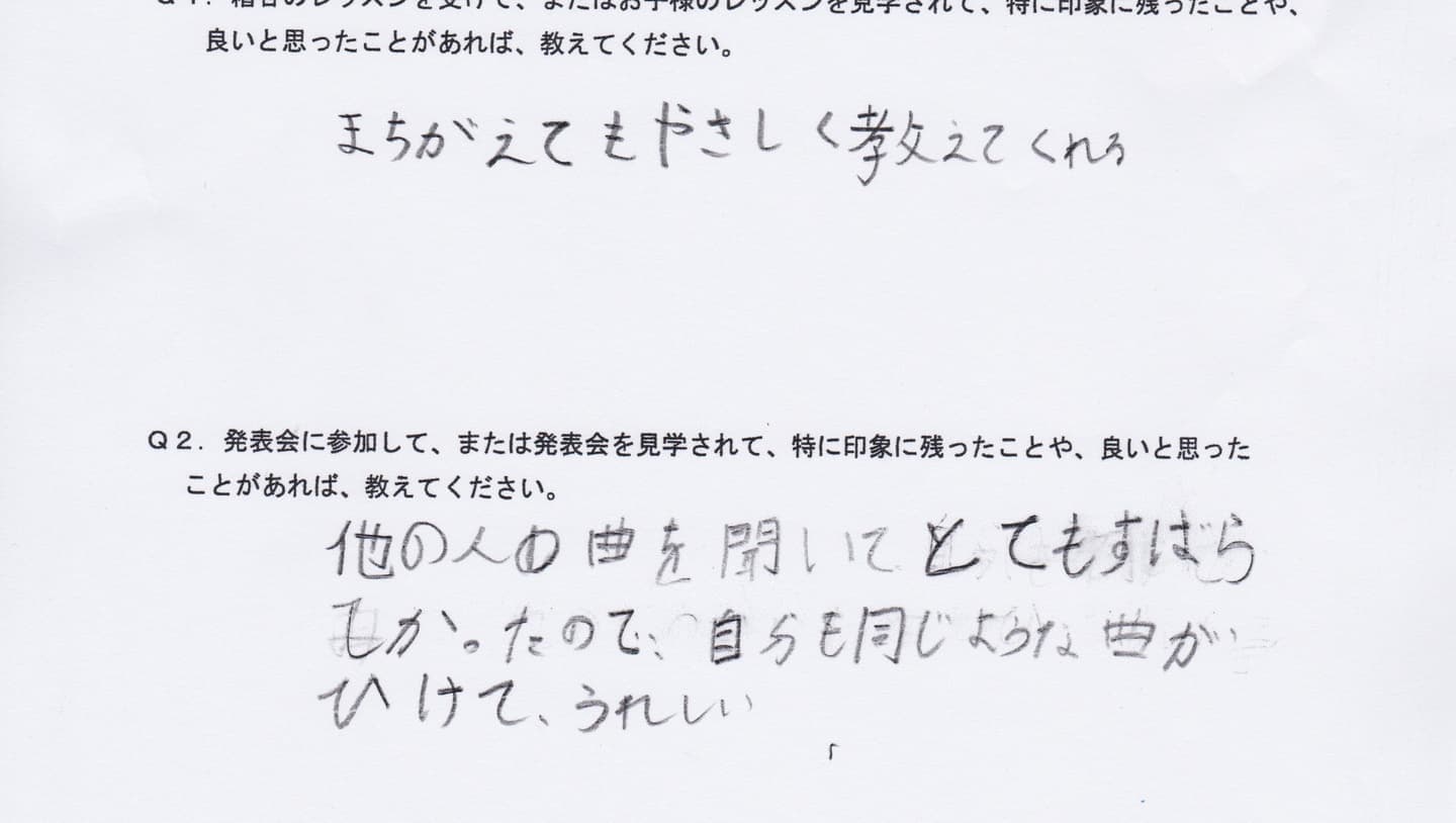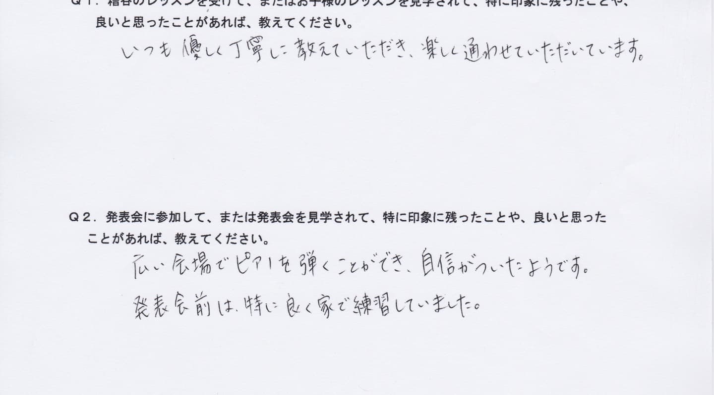 初めてピアノを習いましたが、集中力のない息子に対して丁寧に教えていただきありがとうございました。