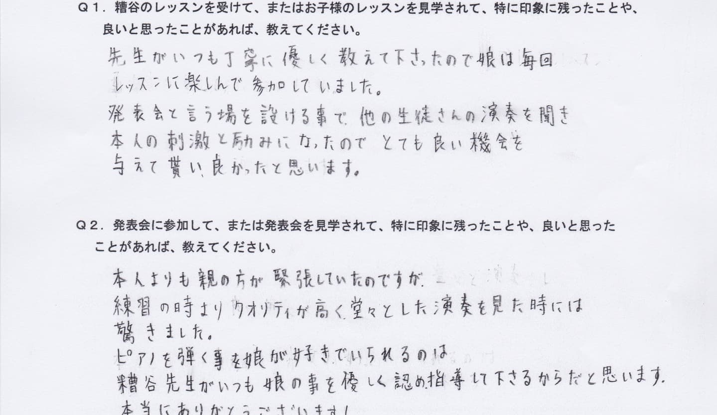 ピアノを弾く事を娘が好きでいられるのは、糟谷先生がいつも娘の事を優しく認め、指導して下さるからだと思います。
