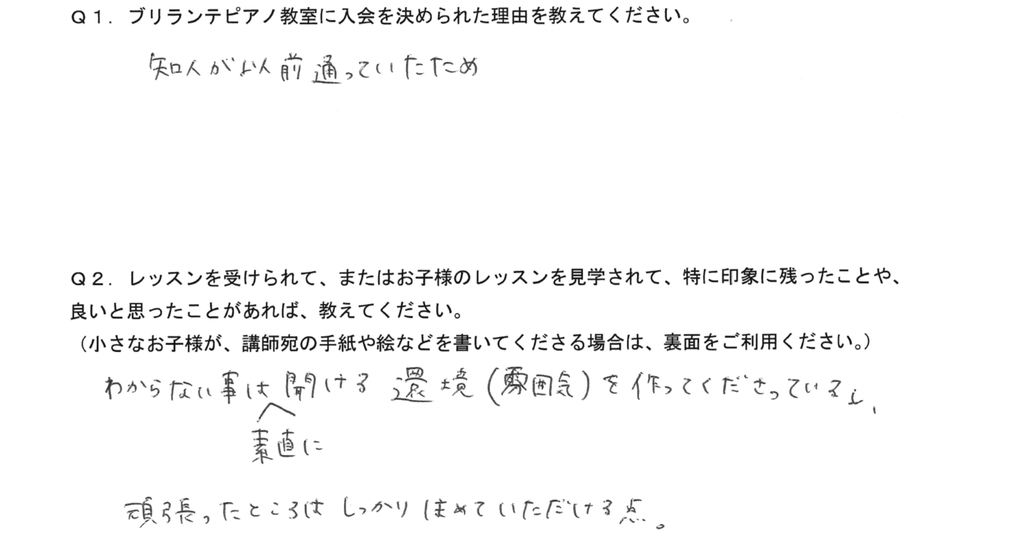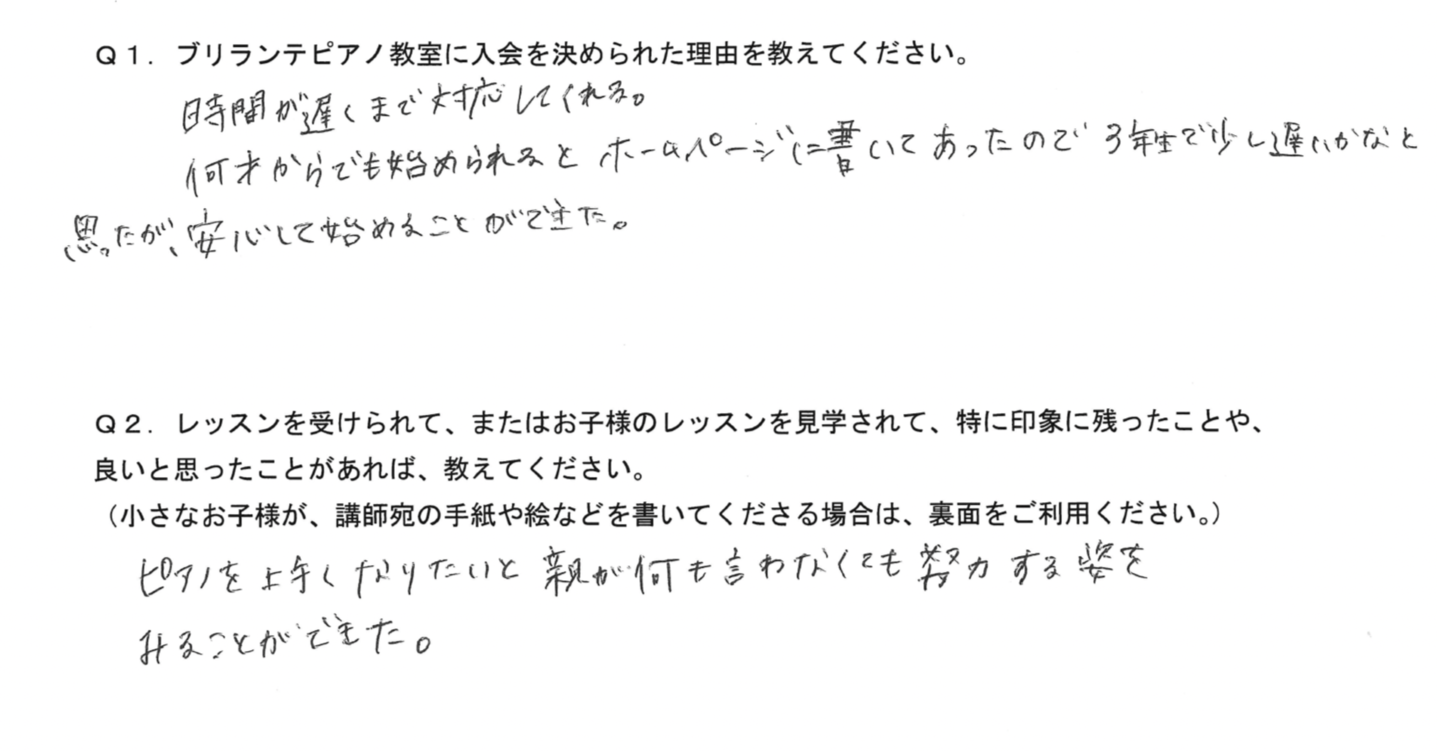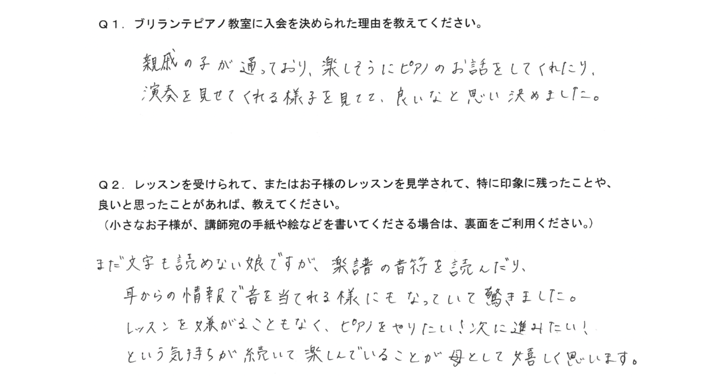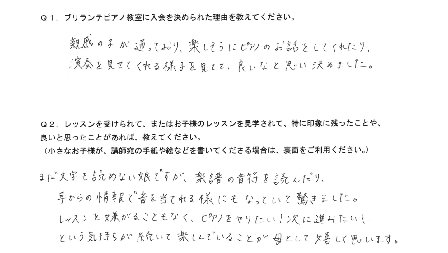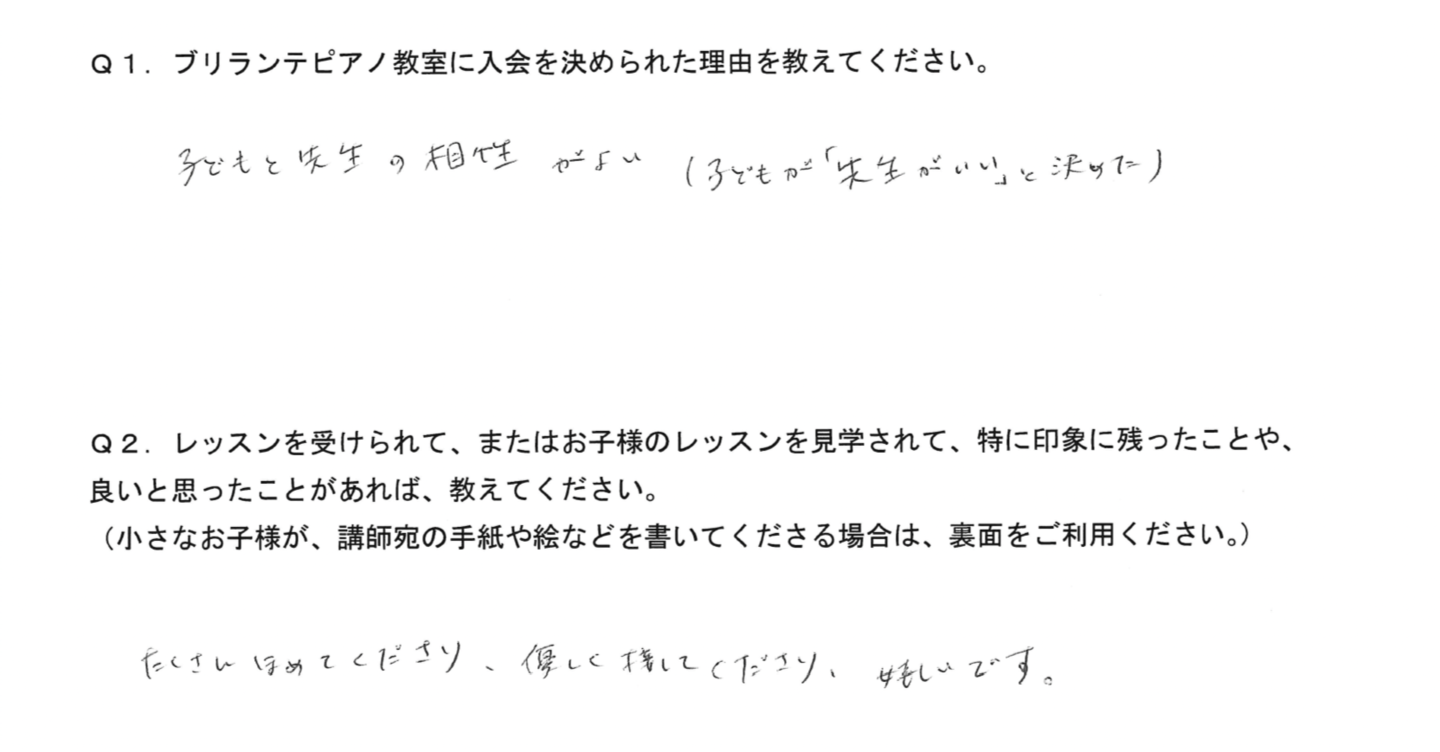 「今日はこんな所を褒められた!」「先生が優しい」とよく言っているので、親としても楽しくピアノが出来ているのが何よりも嬉しいです。