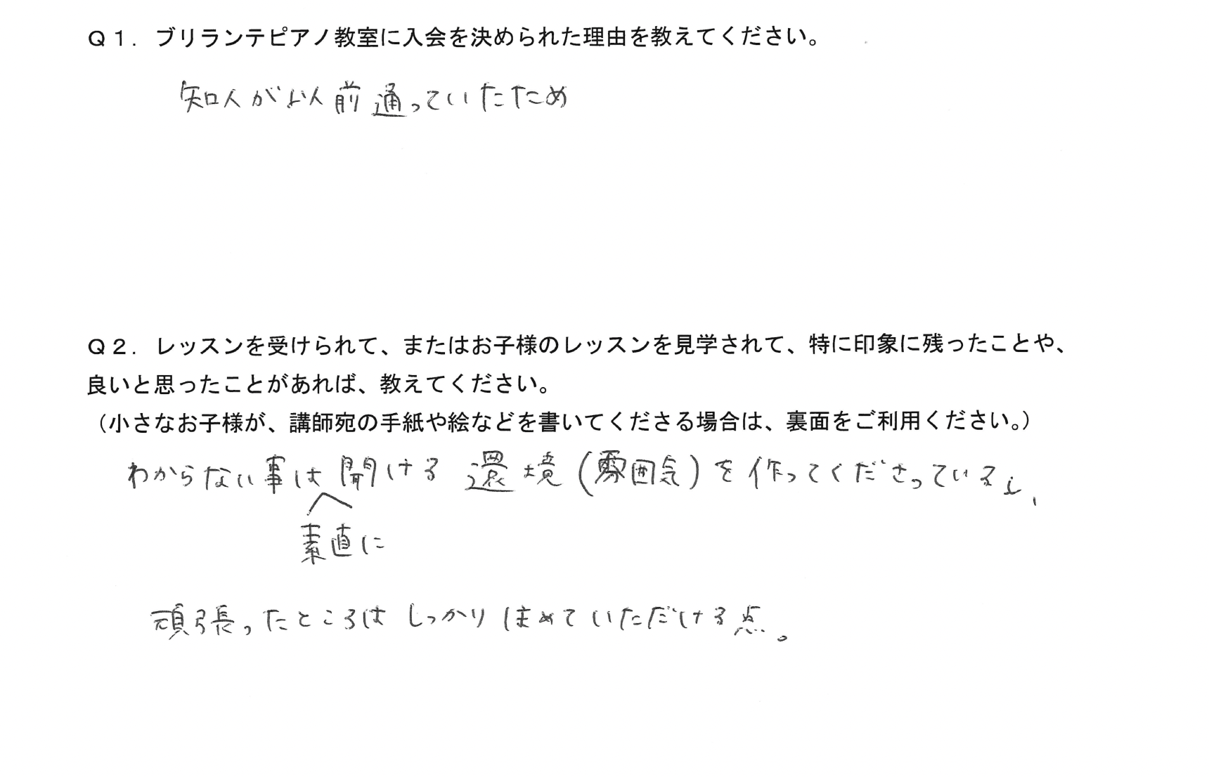 Q2.レッスンを受けて、またはお子様のレッスンを見学されて、特に印象に残ったことや、良いと思ったことがあれば、教えてください。
